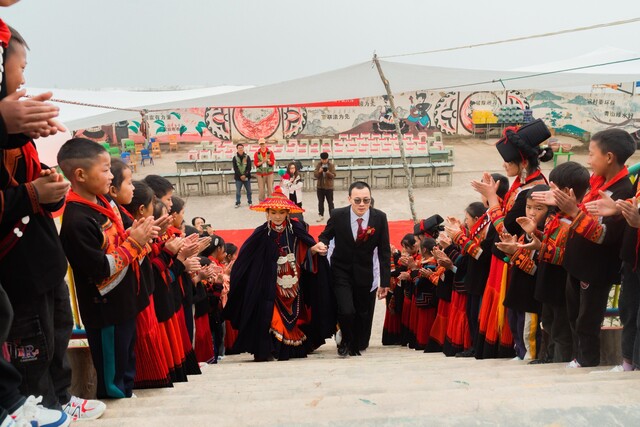 于是,在五月的最后一天,够峨村在群山环抱中洋溢着喜庆的欢笑声:在姚俊玲支教的小学校园里,村民身着盛装,妇女们为姚俊玲梳妆打扮、唱着优美的出嫁歌,姑娘们向前来接亲的人们泼水表喜庆,小伙子们则摔跤、摸锅灰。婚礼仪式上,诺鼎爱心小学的孩子们特意为两位老师演唱彝族歌谣《弟弟的眼眸》,两位村里的长者表演了彝族克哲。