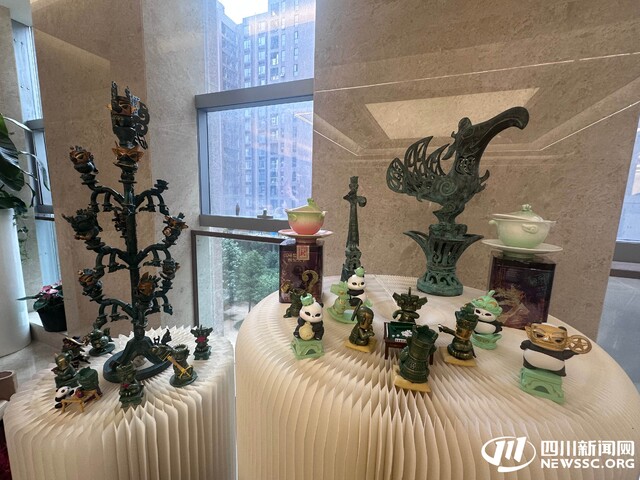 文创产品展示区,广汉市三星堆文旅发展有限公司文创产品设计师何慧带来了2025年新品——太阳神鸟系列手办盲盒。“这一盲盒系列以三星堆青铜神树为设计元素,融入卡通风格,让文物变得俏皮可爱,太阳神鸟手中分别拿着三星堆代表性文物,比如金杖、金面具、陶猪等。让游客在把玩的同时也能更加了解三星堆文化。”何慧告诉记者,这种“盲盒+单盒支架”的形式,打破常规文创形式,使其更加具有收藏价值,上市单月销售额约17万元。