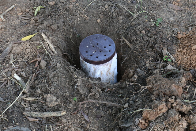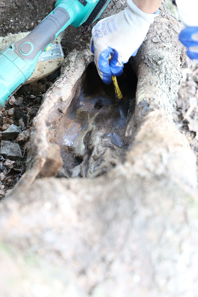 无人机在古树头顶嗡嗡盘旋,精准喷洒着驱虫药剂;树上,两名技术人员正在清理树干腐朽物并刷上了古树专用防腐剂,防止树体进一步腐烂;树下,十几名技术人员挥舞着锄头,在树周挖出8条呈“米”字型放射状的复壮沟,将生物有机肥与土壤充分拌合后填埋进去。李昆伦边忙活边解释:“现在埋的这12根透气施肥管,就相当于给古树装了‘呼吸机’。”随后,18根有机棒肥也被埋进土里,未来两年,它们将持续为古树“输血”。