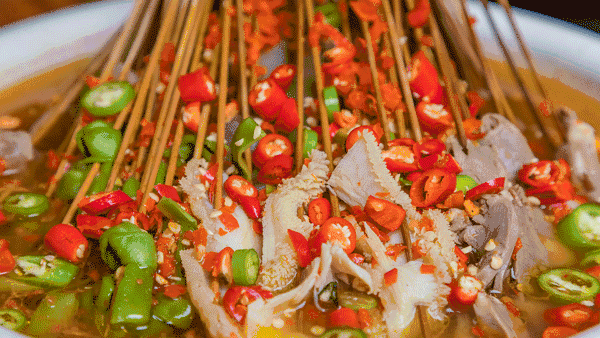 店家们介绍,最初,钵钵鸡的食材为鸡肉,经过百年来的演变,钵钵鸡变成了现在菜品繁多的美食。其工艺是将煮熟的鸡肉、猪肉、牛肉和各类素菜,串上竹签,放入盛满秘制汤底的陶钵浸泡入味。食用时,抽取竹签便可。