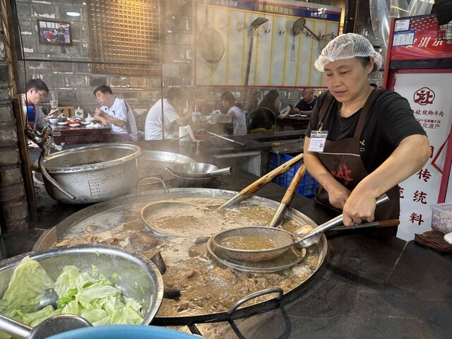 商家在显眼处支一口大锅,锅里煮着牛肉,香气扑鼻。杜卓滨 摄