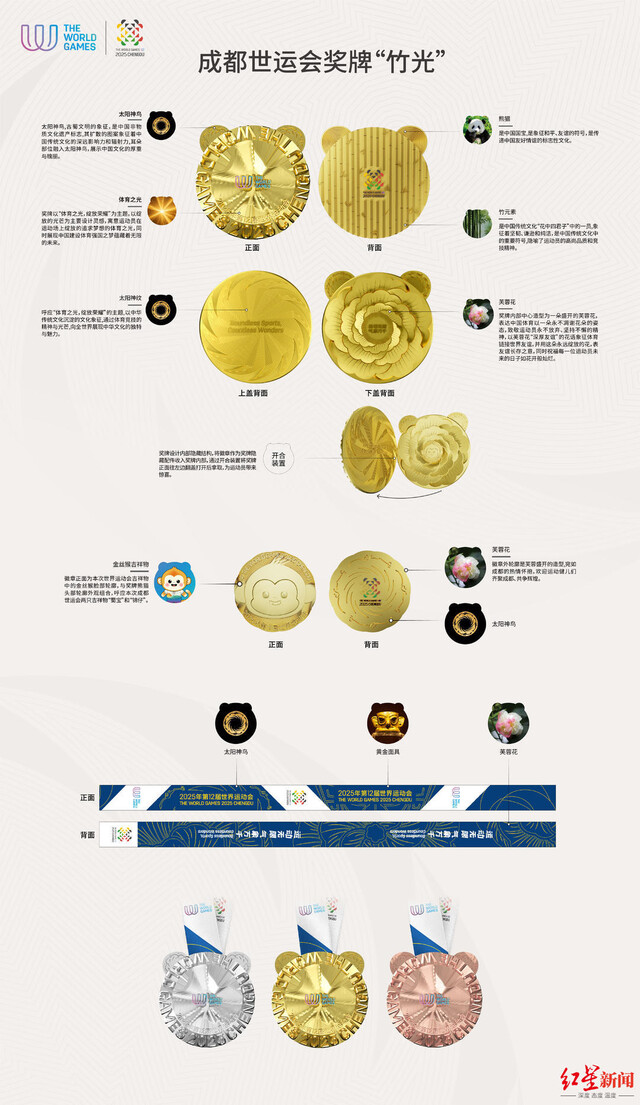 他表示,因此,他也希望通过奖牌设计,展现成都绿色、环保的城市形象,“我们将奖牌背面设计为竹林的感觉,大熊猫以竹为食,竹,象征着高洁、正直,也有着‘节节高’的美好含义。因此,我们使用竹节与竹叶的造型,也正诠释了运动员勇攀高峰的向上精神,希望能够传递出绿色城市的氛围。”