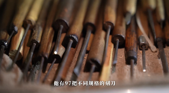 黄健是土生土长的纳溪人,师从竹雕工艺大师朱云华,从事竹雕已有16年。他有97把不同规格的刻刀,这些刻刀的弧度被严格控制,最细的刀尖仅0.3毫米,可以说,一件竹雕作品的成败,是真正取决于“毫厘之间”。