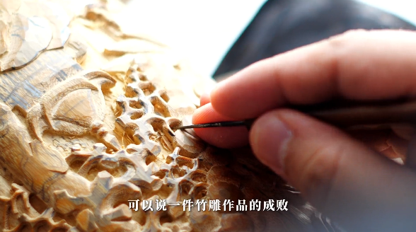 纳溪竹雕第五代传承人 四川省第八批省级非物质文化遗产代表性传承人黄健:最复杂的雕刻技法就是镂空雕刻,它需要小心翼翼反反复复的,在竹纤木之间移动。雕刻技法讲究的是一气呵成,不然就会前功尽弃。