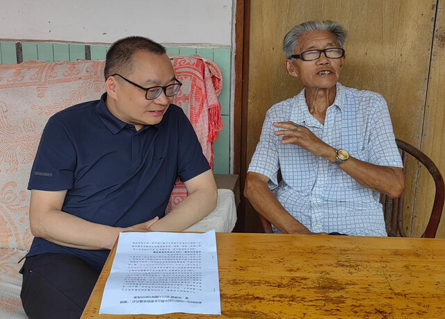 黄劲松与徐长华交流,了解当时叫响“要想富,先修路”口号的情况。眉山市党史和地方志编纂中心供图