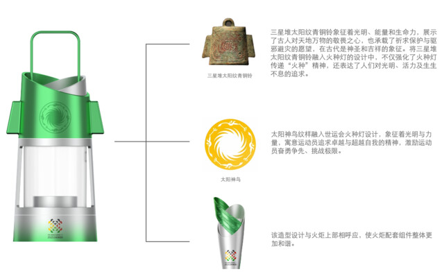 太阳神鸟纹样则被融入火种灯的顶部,象征着光明与力量,寓意运动员追求卓越与超越自我的精神,激励运动员奋勇争先、挑战极限。火种灯的造型设计与火炬上部相呼应,使火炬配套组件整体更加和谐。