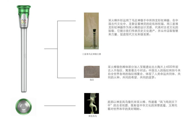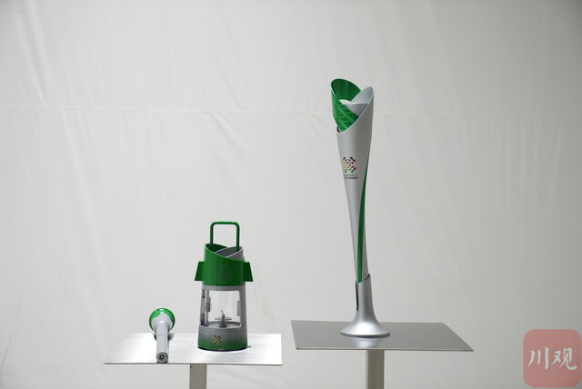 竹是四川最具有代表性的植物,也是成都世运会火炬的重要元素。记者看到在火种灯、火种盆、采火棒的顶部都用到了绿色,呼应火炬上的竹元素。