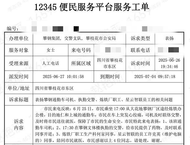 “表扬攀钢通勤车司机、执勤交警、炼铁厂职工何家、星云智联员工……”近日,攀枝花市12345便民服务平台收到了一条特殊工单。与其他工单不同,这份工单既不是投诉,也不是表达诉求,而是一名受救助群众表达谢意的肺腑之言。