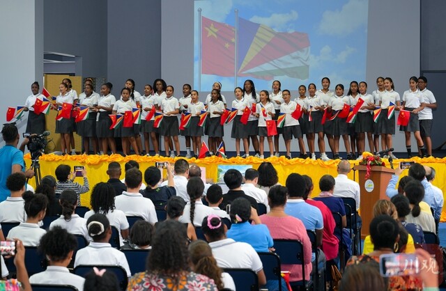 当地时间7月9日,塞舌尔维多利亚市独立学校的学生用中文演唱歌曲。