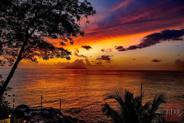 塞舌尔瑰丽的海边落日景观。