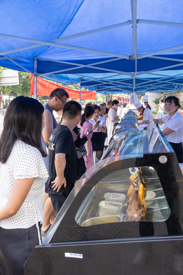 每天下午,锦苑宾馆厨师欧阳青要守在摊位前炸40多只乳鸽。正当盛夏,欧阳青和同事们从相对舒适的酒店内走到了炎炎烈日下。尽管如此,整个团队达成的一致是:走出去,酒店和员工才有可能把危机变转机!