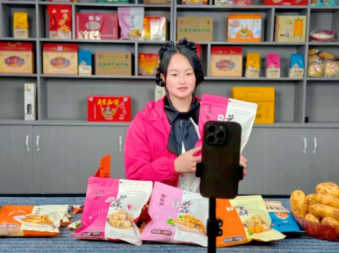步入基地,繁忙景象扑面而来:在敞亮的产品展示区,花生、土豆、油茶等本地特产琳琅满目;标准化直播间内,兰妹儿正声情并茂地介绍新上市的花生酥;物流配送中心,工人们熟练地分拣打包,一辆辆快递车整装待发。