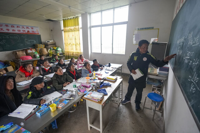 2019年5月27日,曲比史古(右一)在给五年级的孩子们上数学课。新华社记者 沈伯韩 摄