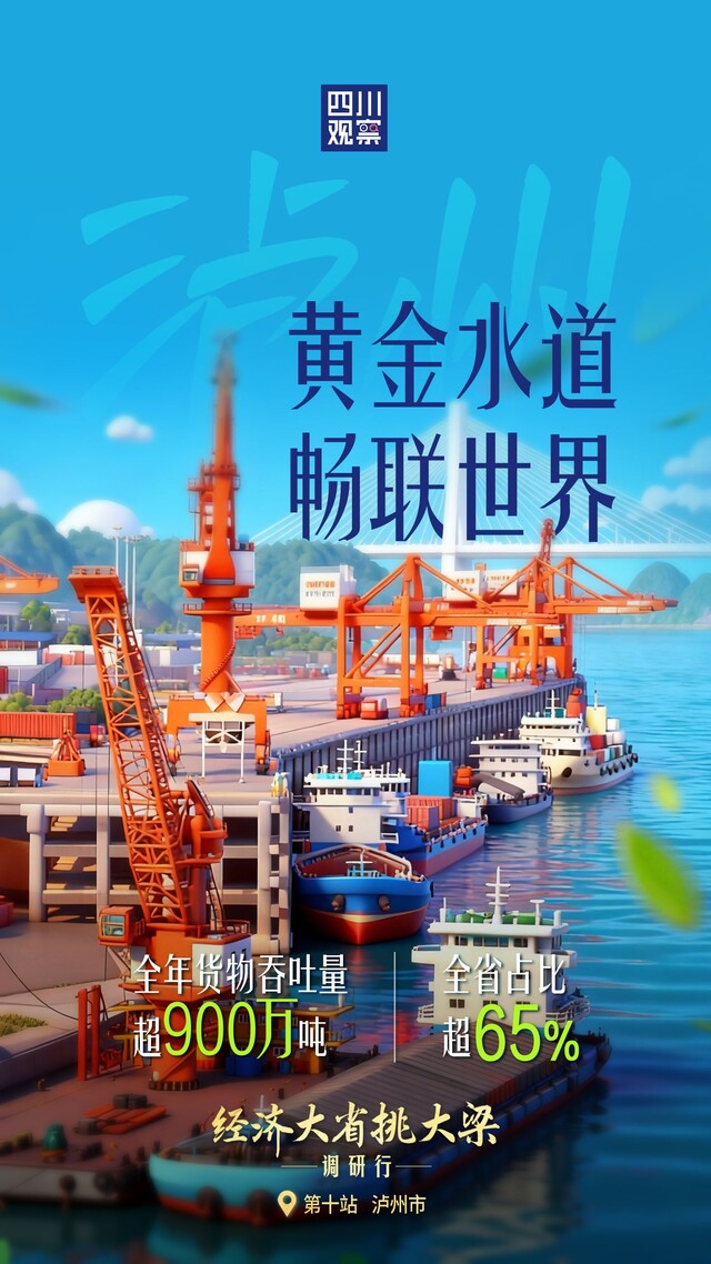 这里拥有四川第一大港——泸州港。黄金水道,畅联世界。去年,全市港口货物吞吐量突破900万吨,集装箱吞吐量突破23万标箱大关。全省占比65%以上。