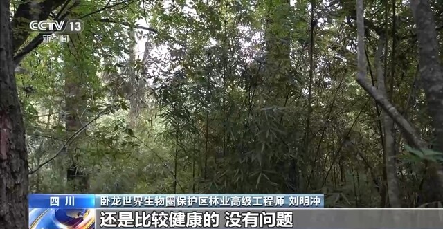 卧龙世界生物圈保护区林业高级工程师 刘明冲:根据监测结果来看,现在冷箭竹的生长是比较健康的,首先它没有什么病虫害,第二个没有发现开花的,第三个就是没有明显的因为气候变化而导致竹子枯死的状况,新生的竹笋出笋率是比较健康的。另外根据对大熊猫采食冷箭竹的痕迹,以及它的粪便各方面来进行分析,我们发现大熊猫还是一如既往比较喜欢吃竹子,所以我们认为大熊猫的食物链还是比较健康的,没有问题。