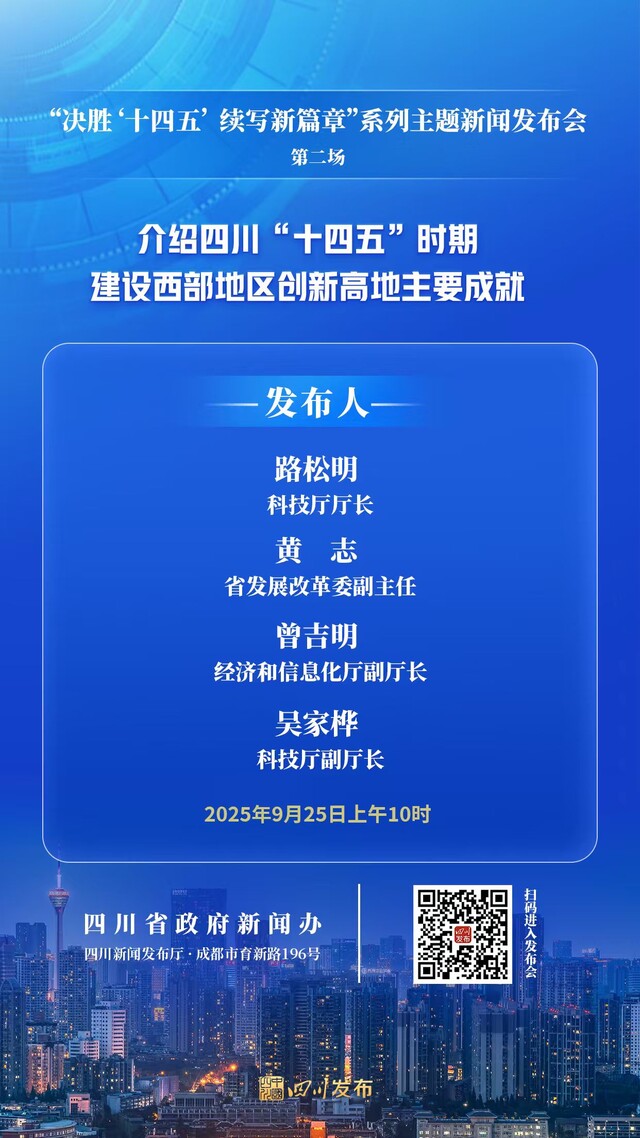 2025年9月25日(星期四)10:00,省政府新闻办将在四川新闻发布厅举行“决胜‘十四五’ 续写新篇章”系列主题新闻发布会第二场,科技厅厅长路松明围绕四川“十四五”时期建设西部地区创新高地主要成就作介绍并答记者问,省发展改革委副主任黄志、经济和信息化厅副厅长曾吉明、科技厅副厅长吴家桦参加答记者问。四川发布客户端将全程图文直播,敬请关注!