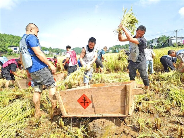 安居区三家镇土祠村,种植大户组织抢收水稻。 全媒体记者 吴奉家 摄