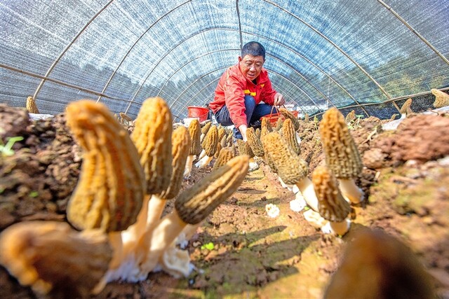 船山区永兴镇花果村,种植户在大棚里采收羊肚菌。全媒体记者 吴奉家 摄
