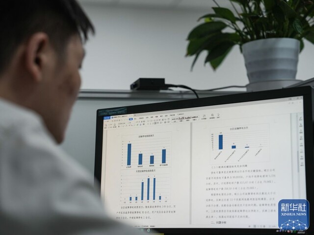 朱鹏宇在办公室编写电力运行分析报告,落实下一步运行改进计划。