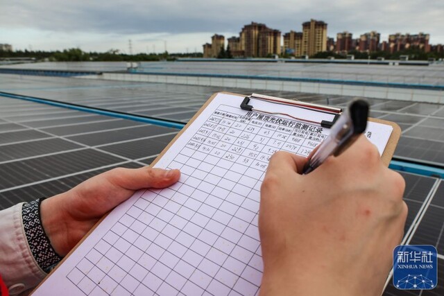 在四川都江堰经济开发区,朱鹏宇在工业用户屋顶对光伏板运行情况进行例行检查并记录相关数据。
