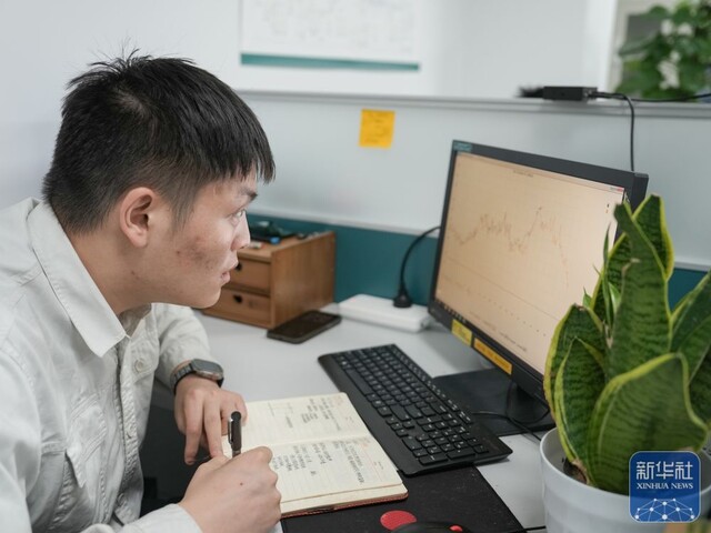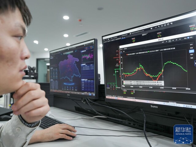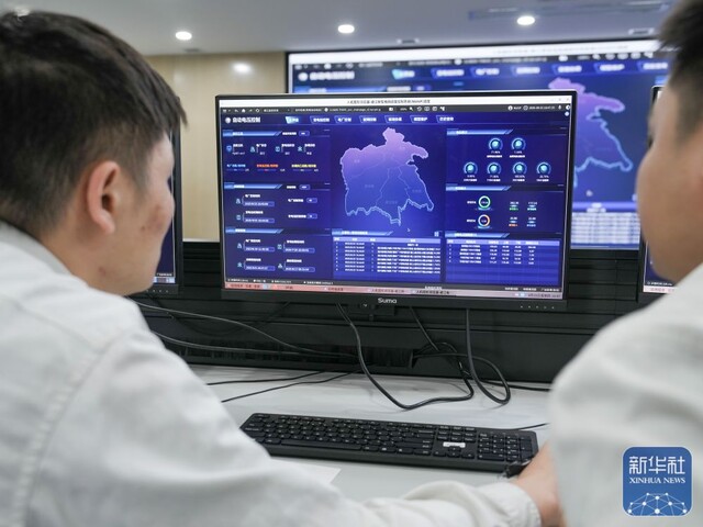 在国网岷江供电公司电力调度控制中心,朱鹏宇和同事对电力系统整体运行情况的各项指标数据进行监测。