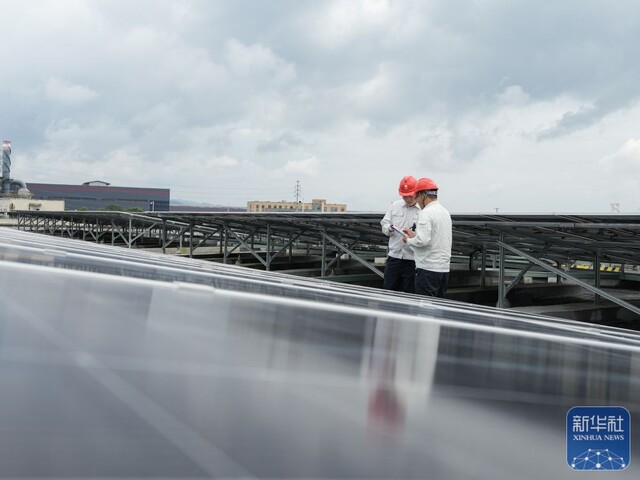 在四川都江堰经济开发区,朱鹏宇(左)和同事检查工业用户新装屋顶光伏板。