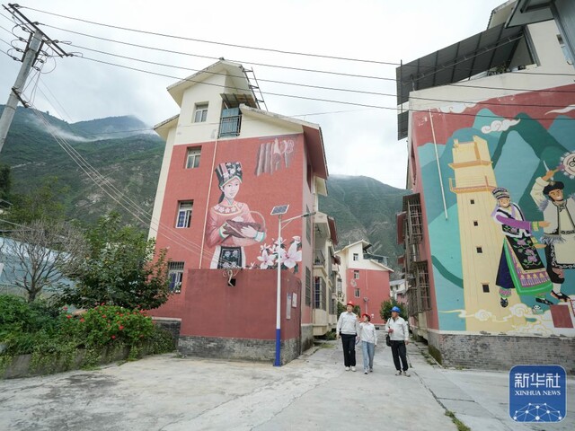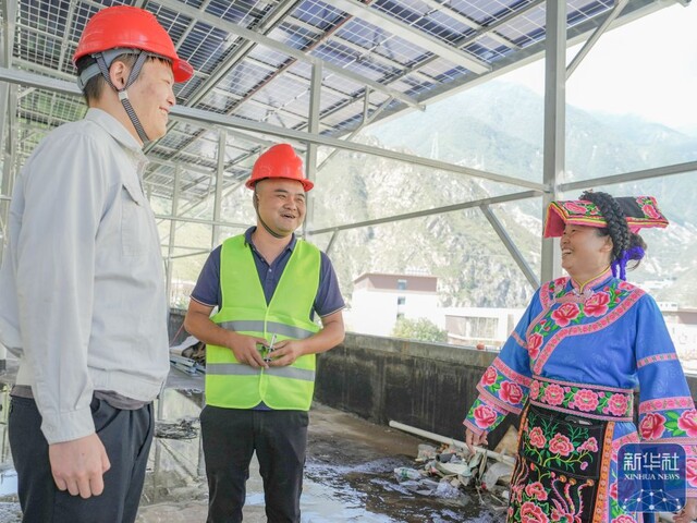 在四川省汶川县威州镇万村,朱鹏宇(右)和村民了解新装屋顶光伏板的情况。