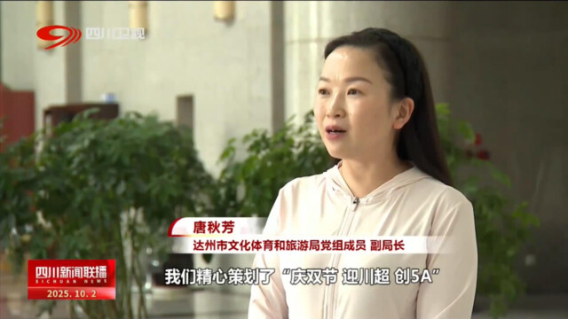 达州市文化体育和旅游局党组成员、副局长 唐秋芳:我们精心策划了“庆双节 迎川超 创5A”文旅嘉年华活动,同步举行秋游达州促消费活动,发放文体旅消费券150万元,吸引更多游客走进达州,亲身感受“巴风賨韵・安逸达州”的独特魅力。
