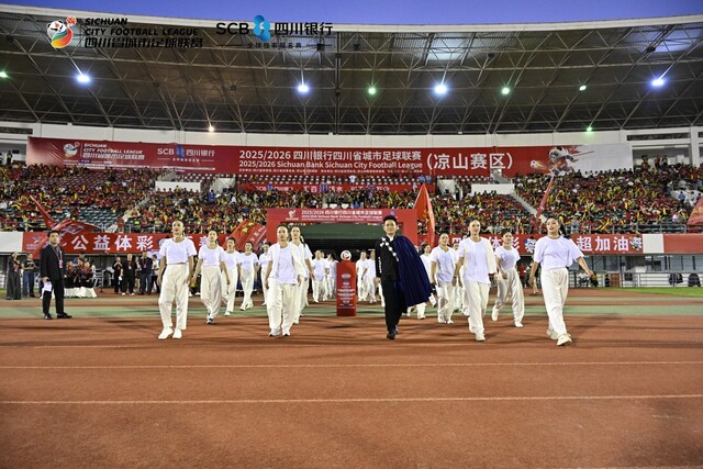 晚7时左右,赛前暖场环节开始,看台上数十面巨幅队旗在灯光映照下格外醒目,现场氛围被推向第一个小高潮。从凉山州普格县走出的“妞妞合唱团”登台献唱《玉盘》,孩子们清澈的歌声与饱含中秋意蕴的旋律交织,将家国团圆的温情洒满赛场,引得全场掌声经久不息。随后,凉山歌舞团带来特色表演《嘎哟啦》,演员们身着绚丽彝装,用欢快的舞姿与嘹亮的歌声传递彝族“好稀客呀”的热情问候,台下球迷跟着旋律轻轻哼唱。在现场观众雷鸣般的掌声中,双方球队成员还互相交换礼物,体现了“川超”赛事中惺惺相惜的体育精神与地域足球的凝聚力。更让人暖心的是,恰逢国庆佳节,现场还为276位国庆期间过生日的球迷送上专属祝福——当庆祝生日的歌曲旋律响起,球迷们纷纷对着身边素不相识的“寿星”道贺,看台上满是欢声笑语,陌生的距离在这一刻被彻底拉近。
