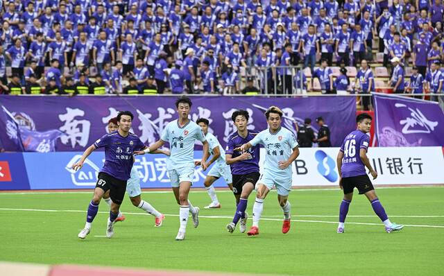 10月2日对战南充队时,这份倔强更显滚烫:游爽虽没能上场,却坐在替补席上紧盯赛场,用嘶吼为队友加油,随时准备待命;陈嵩脸上缠着厚厚的白色绷带,汗水顺着缝隙往下淌,模糊了视线仍上场拼命防守;杨一跑动时刻意护着伤处,可每当南充队发起进攻,他依旧第一个冲上去封堵。