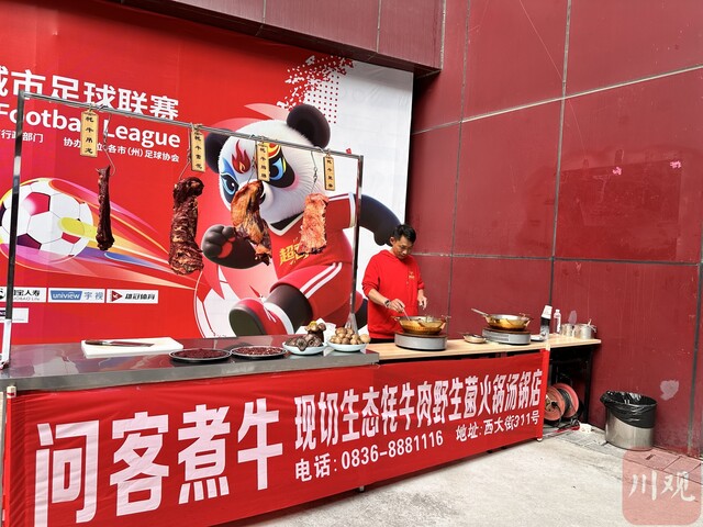 足球不止在场上 ,更在集市与街头。在赛场外围,“活力赛场·藏韵市集”人头攒动,来自甘孜和绵阳的特色产品集中亮相,每个摊位前都围满了询价购买的游客。牦牛肉干、野生菌菇与青稞饼散发着诱人香气,绵阳即食米粉、江油肥肠罐头等产品让现场观众轻松带走美味……