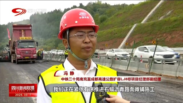 中铁二十局南充至成都高速公路扩容LJ8标项目经理部副经理 冯静:我们正在紧张有序推进右幅沥青路面摊铺施工,冲刺年底成南高速扩容项目主线通车目标。通车后,将成为连接成都、遂宁、南充最为便捷的高速。双向八车道的高速大通道对于进一步提升东向出川通行效率,优化成渝地区双城经济圈空间结构,改善区域经济发展条件具有重要意义。