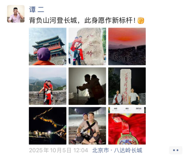 背着母亲登完八达岭长城后,谭卫民发了条朋友圈纪念。