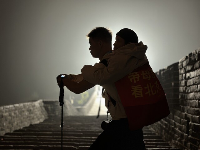 “快到北七楼时,天色已经暗下来了,我发现前面的路好像被封锁了,心里有些失落。”谭卫民告诉记者,工作人员看到后,引导他通过一条小路攀向北八楼,最终他背着母亲成功登完八达岭长城,“下山时,工作人员主动为我们打了手电筒补光照明,非常贴心。一路上也有游客帮我们拍照,为我们加油鼓劲,都非常感动。”