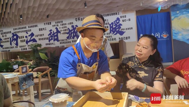 店门口的透明厨房里,自闭症患者天天、欧阳正专注地包着饺子。老师提前拌好馅料,他们拿起饺子填入馅料,再轻轻捏出规整的形状。这里没有数量要求,若是包累了,他们便会去店内舞台上弹一会儿钢琴。