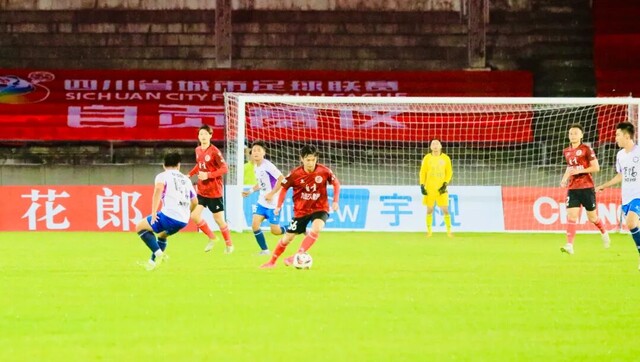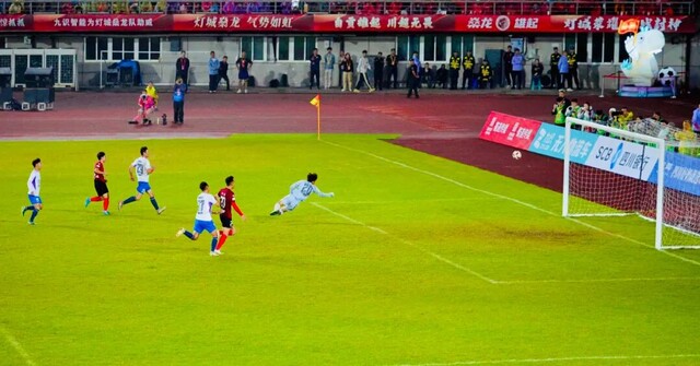 比赛开始后,场上对抗激烈,自贡队开局便展现出强烈攻势。第11分钟,资阳队门将在禁区内违例犯规,自贡后卫杨航一记势大力沉的间接任意球直挂网窝,先拔头筹。