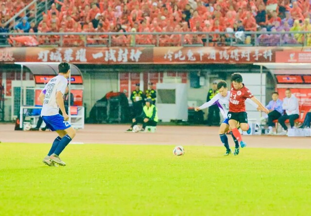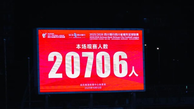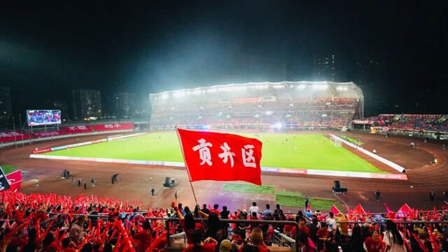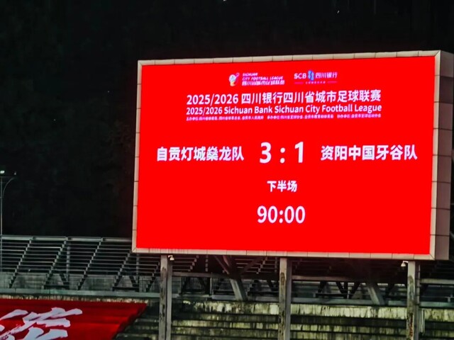 10月12日晚,川超联赛南川赛区开启第四轮比赛日,自贡灯城燊龙队主场迎战资阳中国牙谷队。尽管秋雨凉凉,但自贡南湖体育中心现场气氛火热,共吸引两万余名球迷到场。经过90分钟激战,主场作战的自贡灯城燊龙队以3:1战胜资阳中国牙谷队,全取三分,以2胜2平积8分的战绩继续领跑川南赛区积分榜。