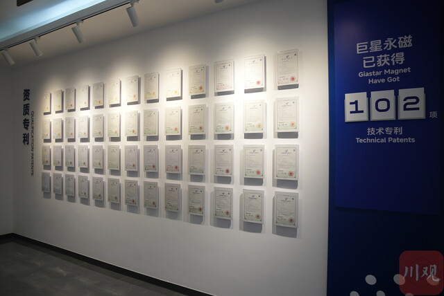 更值得称道的是技术突破,在巨星永磁的文化展示厅,“巨星永磁已获得102项技术专利”的专利展示墙格外醒目。其研制出“超高性能58SHT磁钢”在今年2月举行的四川省绵阳科技城创新成果发布会上发布,性能实现多项突破。今年又率先研发出无重稀土的50SH牌号产品,在保持性能不变的情况下降低成本5%—10%。