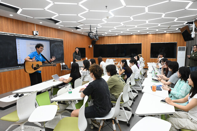 在川音的智慧教室里,轻柔舒缓的旋律悠然流淌,这并非普通的演奏,而是学生为孤独症儿童精心创作的《你好》歌曲。“我们希望能用这些柔和而友好的音符,为孩子们架起一座通往世界的桥梁。”歌曲创作者、大三学生李承玺说道。