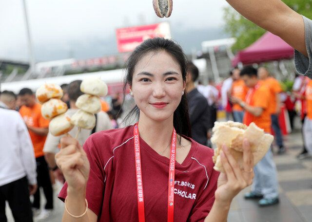 球场外,展示广元特色小吃火烧馍和嘉川包子的球迷。广元观察 高志农 摄
