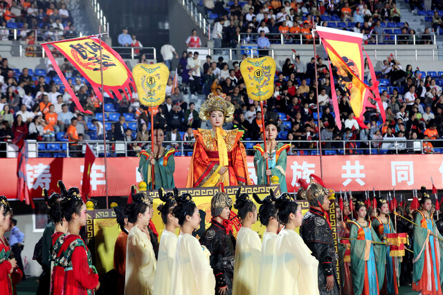 借助川超比赛,广元通过情景剧、非遗展演,将特色文化秀给更多人看。图为 10月3日,广元剑门关雄关队与阿坝州雪山雄鹰队比赛前,广元展演女皇文化情景剧。广元观察 高志农 摄
