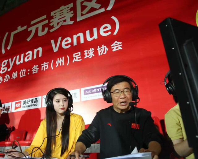 知名体育解说员韩乔生现场解说广元剑门关队与阿坝州雪山雄鹰队的比赛。刘仁 摄