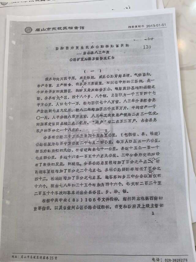 东坡区档案馆保存的关于眉山上个世纪八十年代修路情况介绍。