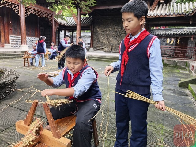 “我今天学会了编草鞋。”在学校隔壁的中国红军城里,在手艺人的指导下,五年级学生白小平坐在凳子上,双手上下翻腾将稻草编织拧紧,很快编织完一只草鞋。