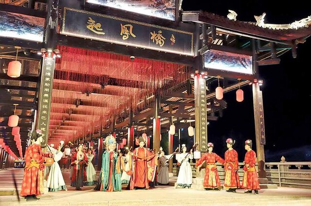 恩阳的文旅融合战略以“空间再生”为突破口,建设演艺之城。万寿宫整体提升改造后,设置“民俗剧场”与“川东北川剧艺术博物馆”,形成“演-展-研”一体化空间。新建的800平方米河派川剧戏楼,可容纳2000余名观众,其飞檐斗拱的建筑风格既保留了明清会馆的韵味,又融入了现代声光电技术。依托大栈房、起凤廊桥、登科公园等,创建演艺场地100余处。其中,万寿宫每年演出超300场。