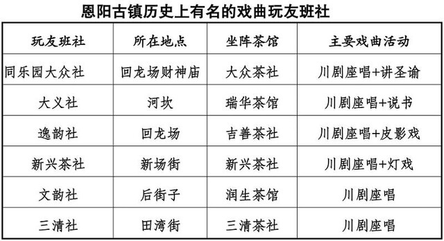 1954年成立恩阳川剧团,创排《斩巴蛇》《四下河南》等剧目,二十世纪60年代并入巴中川剧团,2013年恩阳区重建川剧艺术团,年均演出80余场。被称为“川剧界的莎士比亚”黄吉安,曾在恩阳采风6年,创作了20多部川剧剧本。从恩阳走出“梅花奖得主”肖德美、李乔松等蜚声中外的川剧大师。二十世纪60年代成立的花丛女子川剧团,以全女性阵容演绎《背鞭》等剧目,曾受张爱萍将军作诗赞誉:“春色满园乐融融,百花丛中一点红,女子组团演乡戏,发扬传统创新风”。