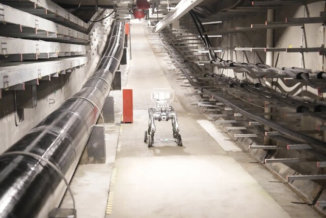 10月23日,记者跟随工作人员走进日月大道综合管廊。刚进入廊内,就看到一只智能巡检机器狗正沿着预设路线行进,银灰色的机身下,四条带轮的机械腿稳健而灵活,遇到前方障碍时,它会自动调整线路,轻松越障,丝毫没有卡顿。