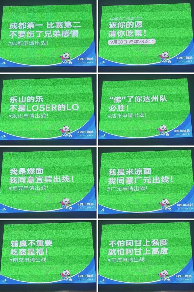 幽默,是城市间最亲切的“放狠话”。自贡对宜宾:“输了不给燃面放盐?”宜宾轻松接招:“宜宾有哪吒,自贡有恐龙,看拿抓擒龙!”成都对遂宁,成都喊话:“听说死海很咸?我们守门员也很闲(咸)!”遂宁霸气回应:“守门员闲?来死海泡温泉!就让成都一直‘漂’!”言语间刀光剑影,满是城市间充满智慧的互动与共鸣,看似挑衅,其实都在玩心机,借比赛夹带私货卷文旅呢。