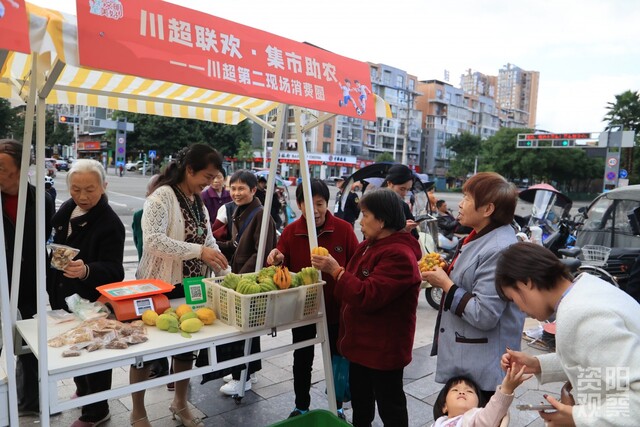 乐至县在新天地商业主体入口广场布置第二观赛区,百余名球迷齐聚助威,“资阳,雄起!”的呐喊声此起彼伏。现场创新融合“观赛+市集”,特色小吃、文创产品、农特产品组成“助威市集”,5户零售商家开展促销。带着孩子观赛的市民张女士说:“虽不能去主场,但在这里和大家一起加油很热血,逛市集也很开心。”这种模式既提升观赛体验,又为本地商户提供展示平台,激活县域消费活力。