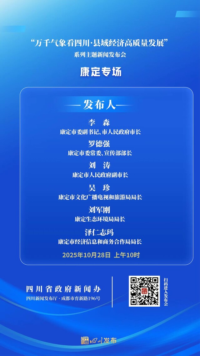 2025年10月28日(星期二)10:00,省政府新闻办将在四川新闻发布厅举行“万千气象看四川·县域经济高质量发展”系列主题新闻发布会康定专场,康定市委副书记、市人民政府市长李森围绕“溜溜康定 万态交响 情歌故里奏响县域经济奋进强音”作介绍并答记者问,康定市委常委、宣传部部长罗德强,康定市人民政府副市长刘涛,康定市文化广播电视和旅游局局长吴珍,康定生态环境局局长刘军刚,康定市经济信息和商务合作局局长泽仁志玛答记者问。四川发布客户端将全程图文直播,敬请关注!
